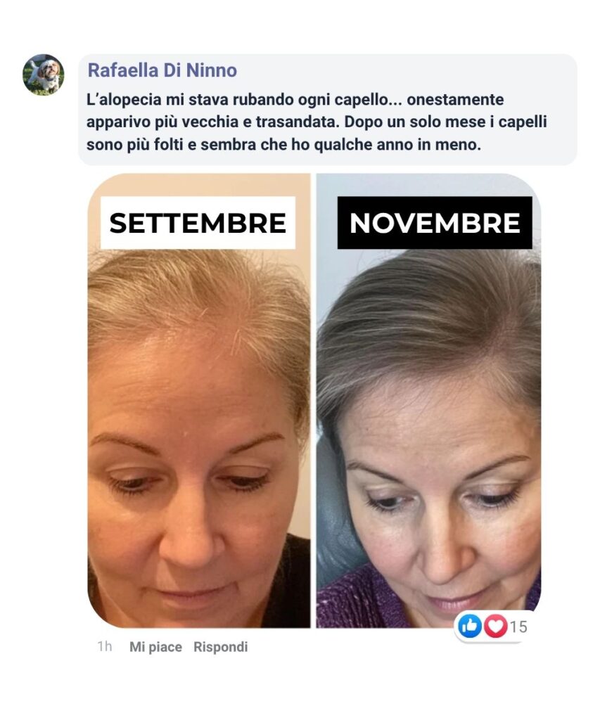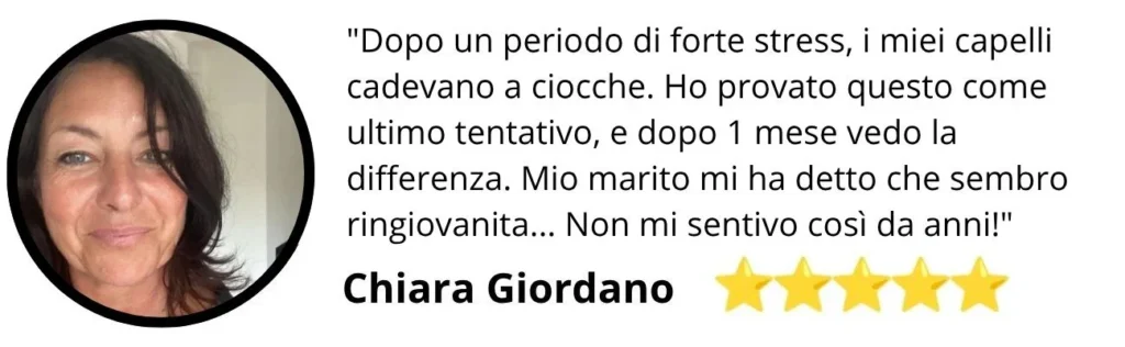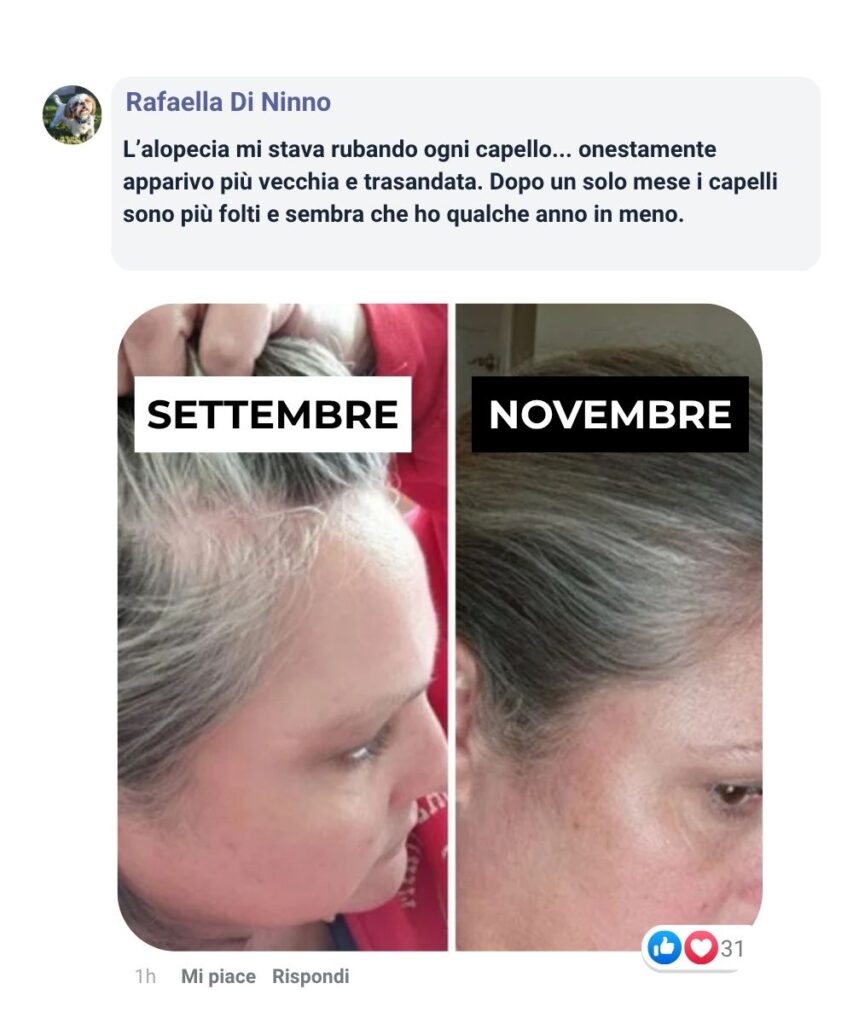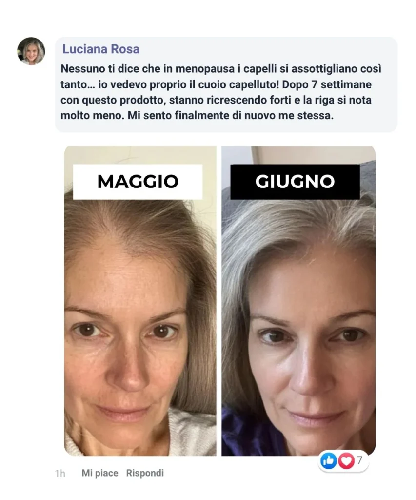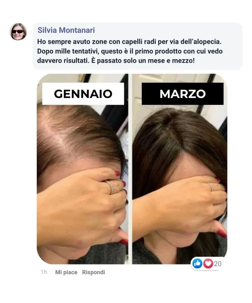 “Ho ereditato i capelli fini di mia madre, ma dopo i 40 anni è peggiorato tantissimo. Ho provato tutti quei costosi integratori e sieri miracolosi che hanno solo lasciato i miei capelli unti e il portafoglio vuoto. Questo, invece, è stato completamente diverso! Lo uso da 2 mesi e i risultati sono incredibili: la mia parrucchiera ha persino notato tutta la nuova ricrescita senza che io dicessi nulla!”