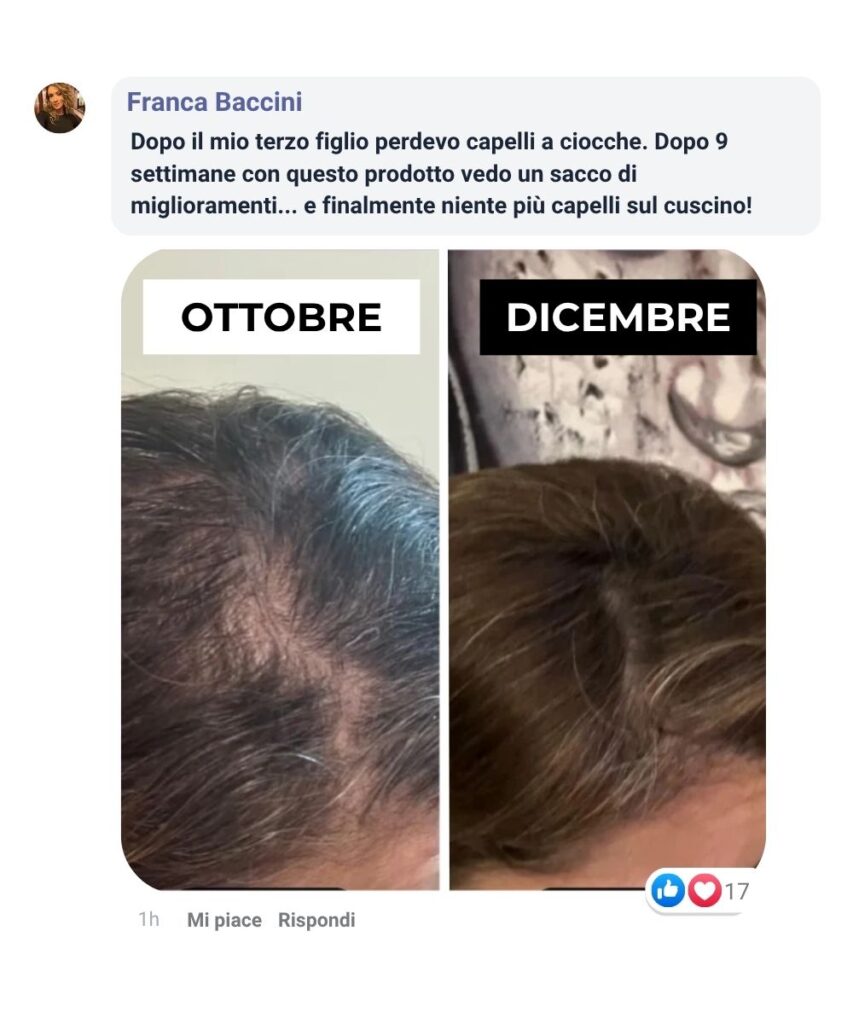 “Dopo il mio terzo bambino, la perdita di capelli è stata peggiore che mai – nelle foto si poteva letteralmente vedere attraverso la zona della mia corona. Uso questo prodotto da 9 settimane e la differenza è incredibile. Mio marito continua a notare tutti i nuovi capelli spuntati che crescono a ciuffetti. Le foto del prima e dopo che ho scattato sono impressionanti. È un sollievo enorme non vedere più ciocche di capelli sul cuscino!”